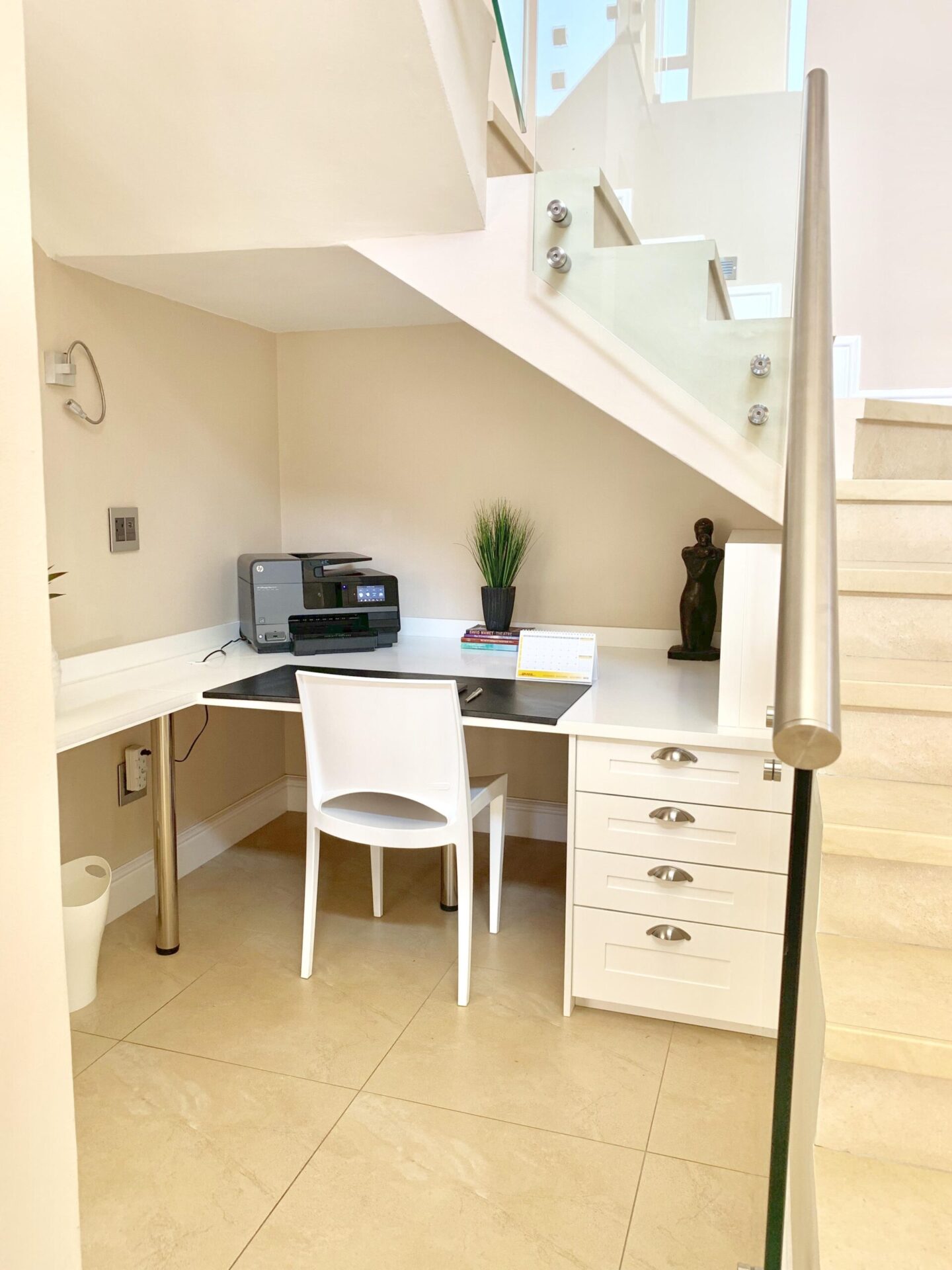 The client brief included the remodelling of the existing kitchen, main bedroom and en-suite bathroom, walk in closets and guest bedrooms with private balconies. The grand staircase railing was removed and replaced with a modern glass balustrade. A study nook was created below the staircase for the children. The central living area is open plan with more private wings closed off with pocket doors that can be easily closed to allow for privacy when entertaining.
